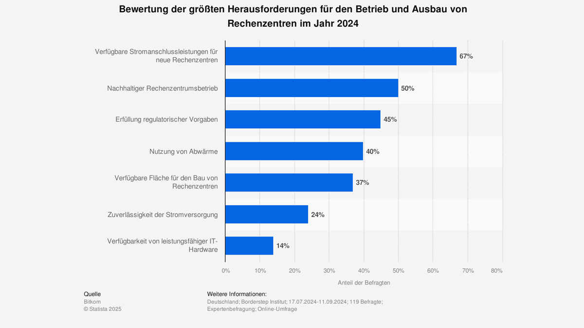 Als größte Herausforderung wurden in einer Befragung aus dem Jahr 2024 die begrenzte Verfügbarkeit von Stromanschlussleistungen für den Standort Deutschland von rund 67 Prozent der Befragten aufgeführt. Außerdem gab rund die Hälfte der Befragten an, dass die Nachhaltigkeit der Rechenzentren eine große Herausforderung darstellen wird.