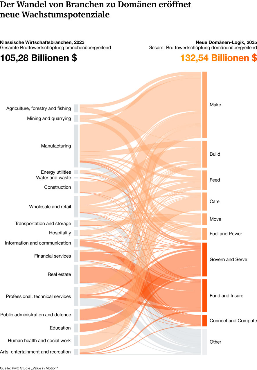 Die aktuelle PwC-Studie „Value in Motion“ bringt es auf den Punkt: Unsere alte Industrielogik hat ausgedient. Sektoren verschmelzen zu sogenannten Domänen, die sich nicht mehr an traditionellen Branchengrenzen orientieren, sondern an grundlegenden Bedürfnissen wie „How we Move“, „How we Care“ oder „How we Build“.