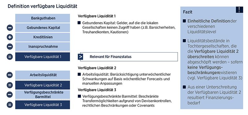vL III: Falls die Transfermöglichkeiten etwa aufgrund von Devisenkontrollen oder Covenants nur mit zeitlichem Vorlauf durchgeführt werden können oder nicht möglich sind, wird das auf der dritten Liquiditätsstufe berücksichtigt: Verfügungsbeschränkte Barmittel werden zum Abzug gebracht.