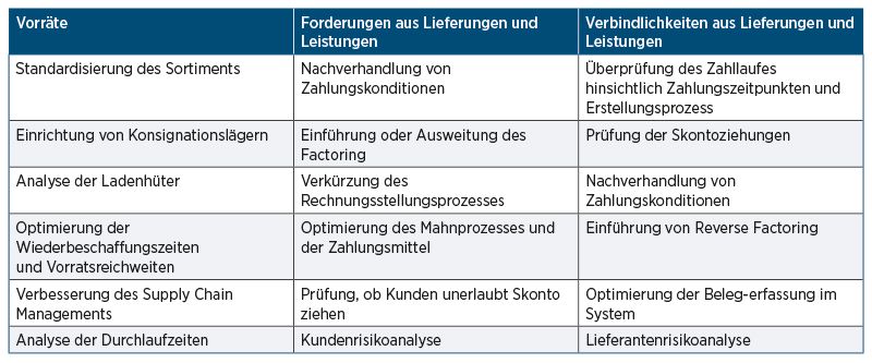 Es gibt eine ganze Reihe von Stellhebeln und Analysen, um das Working Capital gezielt zu steuern. Nachstehend einige der wichtigsten Möglichkeiten: