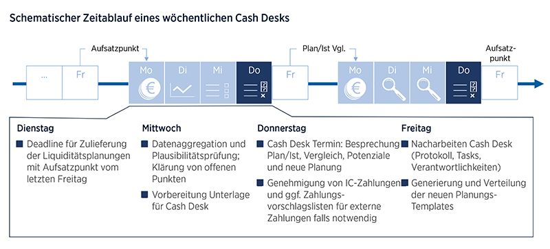 Die grundlegenden Steuerelemente eines aktiven Cash-Managements sind ein täglicher gruppenweiter Cash-Status, ein belastbarer kurzfristiger Liquiditäts-Forecast sowie die Steuerung des Working-Capitals. Diese sollten im Rahmen eines wöchentlichen Cash-Desks analysiert und optimiert werden.