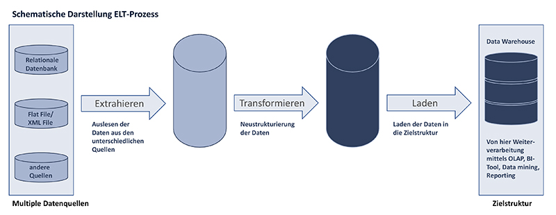 Statt die nötigen Daten manuell zu extrahieren und beispielsweise in Excel zusammenzutragen, wird ein automatisierter ETL-Prozess (extract-transform-load) eingesetzt. Die Daten werden aus unterschiedlichen Quellen und Formaten in eine homogene Zielstruktur überführt und in einer Datenbank abgespeichert.
