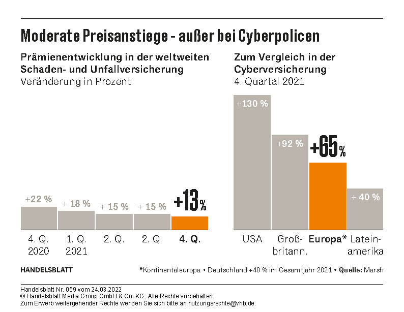 Ein Trend, der sich mit dem Ausbruch des Ukrainekonflikts verstärken dürfte. Bereits im vergangenen Jahr kam es in Deutschland zu Preissteigerungen von durchschnittlich 40 Prozent. Im gehobenen Mittelstand gab es 2021 vereinzelt sogar Beitragssteigerungen von 300 Prozent. „Auch in diesem Jahr rechnen wir mit Prämienerhöhungen in ähnlicher Höhe“, so Behrends.
