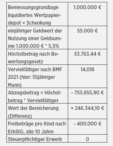 Diese Konstellation hat gleich mehrere Vorteile: Die Geldsumme ist nun mit einem Nießbrauch belastet und wird somit niedriger bewertet. Von der ursprünglichen Bemessungsgrundlage wird der Wert des Nießbrauchs abgezogen, der auf Basis von Vervielfältigern berechnet wird. Nach den Vorgaben des Bewertungsgesetzes ist der Jahreswert der Nutzungen von Barvermögen grds. mit 5,5 % anzunehmen. Dieser standardisierte Jahreswert dürfte nicht selten über jenem für entsprechendes Wertpapiervermögen liegen, so dass eine Bargeldschenkung im Hinblick auf die Bewertung des Nießbrauchsrechts im Einzelfall attraktiver sein kann. Inwieweit die Finanzverwaltung diesen Prozentsatz oder aber einen niedrigeren anwenden möchte, weil das Bargeld zum Erwerb von Wertpapieren durch die Auflage bestimmt ist, kann nicht zweifelsfrei beurteilt werden. Im Optimalfall kann der Anfall von Schenkungsteuer für den Erwerb des Wertpapierportfolios vollständig vermieden werden. Im Ergebnis können auf diese Weise auch Barvermögen oberhalb der steuerlichen Freibeträge steuerfrei übertragen werden.