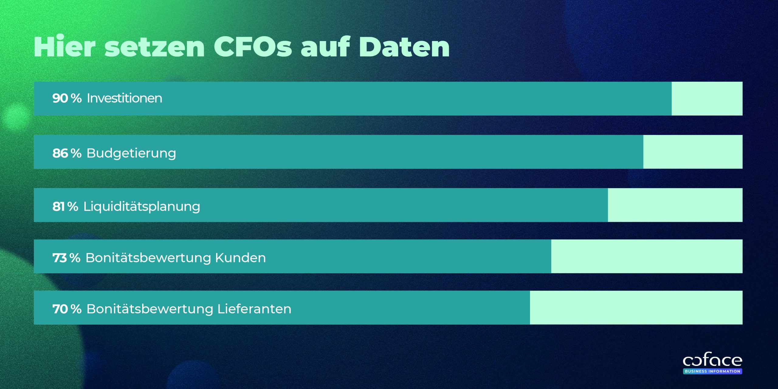 Parallel zur Unsicherheit wächst die Überzeugung, dass Daten der entscheidende Hebel für bessere Entscheidungen sind. 82% der befragten CFOs geben an, heute über deutlich mehr Daten zu verfügen als noch vor fünf Jahren; 81% sehen dadurch eine spürbare Verbesserung ihrer Entscheidungsqualität. Besonders bei Investitionen (9 von 10), Budgetierung (86%) und Liquiditätsplanung (80%) sind datenbasierte Ansätze Standard. Zudem werden Kundenbonitäten (73%) und die Finanzkraft von Lieferanten (70%) systematisch bewertet. Nur noch 22% der Befragten verlassen sich regelmäßig auf ihr „Bauchgefühl“ und weichen bewusst von datenbasierten Empfehlungen ab. Genau hier zeigt sich die Bedeutung verlässlicher globaler Wirtschaftsauskünfte und Unternehmensinformationen: Coface Business Information verbindet die jahrzehntelange Expertise aus der Kreditversicherung mit umfassenden Wirtschaftsdaten aus Märkten weltweit.