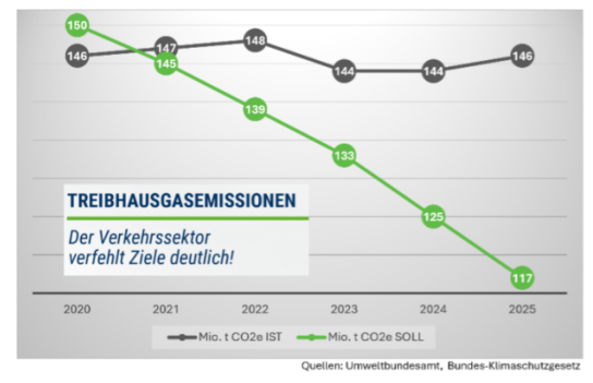 Ein Stück weit entspricht das auch der Realität. Trotz der aktuell verhaltenen wirtschaftlichen Entwicklung verändert sich im Verkehrssektor in Deutschland nur wenig. Die gesetzlich vereinbarten Höchstwerte für den CO₂-Ausstoß wurden auch 2025 deutlich überschritten, die Emissionen sind sogar wieder gestiegen: