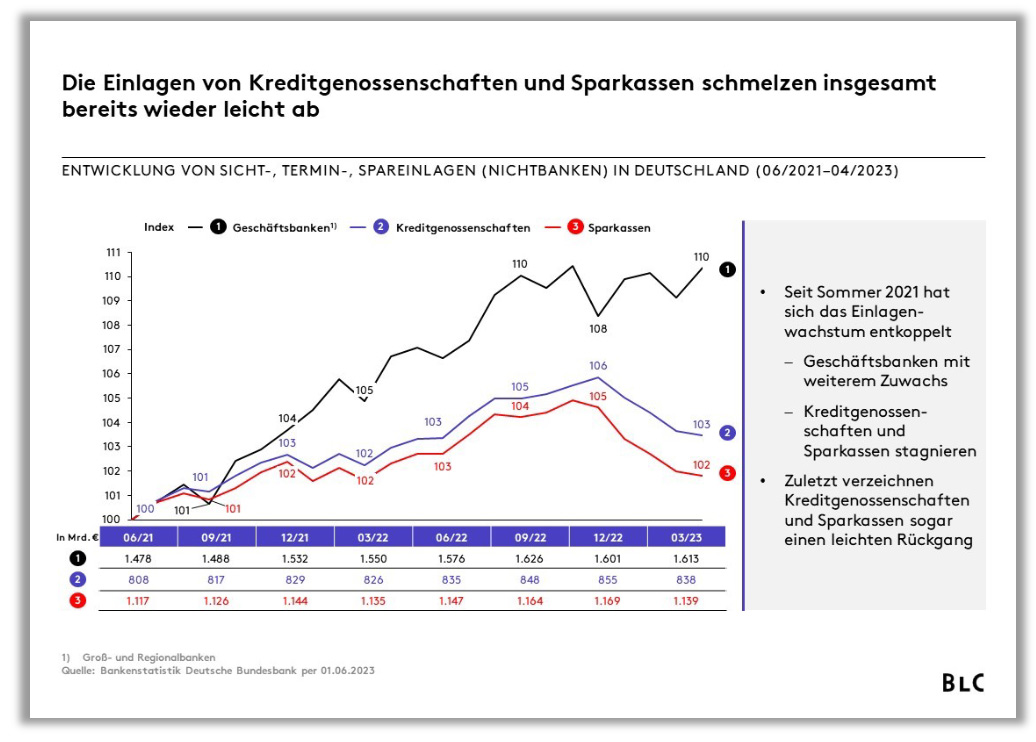 … im Einlagengeschäft der Banken die Wettbewerbsdynamik zurück. Damit endet die Niedrigzins-phase mit „Nullzins“ und Verwahrentgelten. Viele Institute verzeichnen stark gestiegene Zinsüberschüsse – dank „träger“ Passiv-Bestände. Doch zunehmend prägen Kampagnen zur Neugeldeinwerbung auf regionaler und bundesweiter Ebene das Bild. Bereits in Q2 2023 sind Konditionen für Neu-anlagen von Tages- und Festgeldern mit 2,5 bis 3,x % p. a. beworben worden – als prominentestes Beispiel im Mai 2023 die ING mit 3,0 % auf Tagesgeld. Als Ergebnis von Kunden- und Wettbewerberverhalten verzeichnen Genossenschaftsbanken und Sparkassen bereits seit Anfang 2023 abschmelzende Einlagenbestände. Angesichts der makroökonomischen Entwicklungen und der nach wie vor hohen Inflationsrate ist auch für das 2. HJ 2023 und 2024 mit einer Fortsetzung diese Trends zu rechnen.