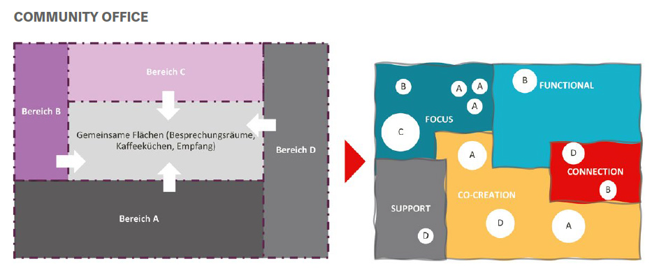 Hier wird der Home Base- bzw. territoriale Ansatz vollständig aufgegeben und durch Module bzw. eine aktivitätsorientierte Aufteilung ersetzt. Die Mitarbeitenden oder Teams entscheiden je nach Bedarf, welche Module sie nutzen möchten: offene agile Flächen und große Besprechungsräume für Kollaboration oder funktionale Arbeitsplätze für individuelle Arbeit und Fokus-Arbeitsplätze für konzentriertes Arbeiten. Attraktive Kaffee- Küchen und Lounges bieten Raum für persönlichen Austausch. Die Zuordnung von Flächen an Fachbereiche gehört damit der Vergangenheit an.
