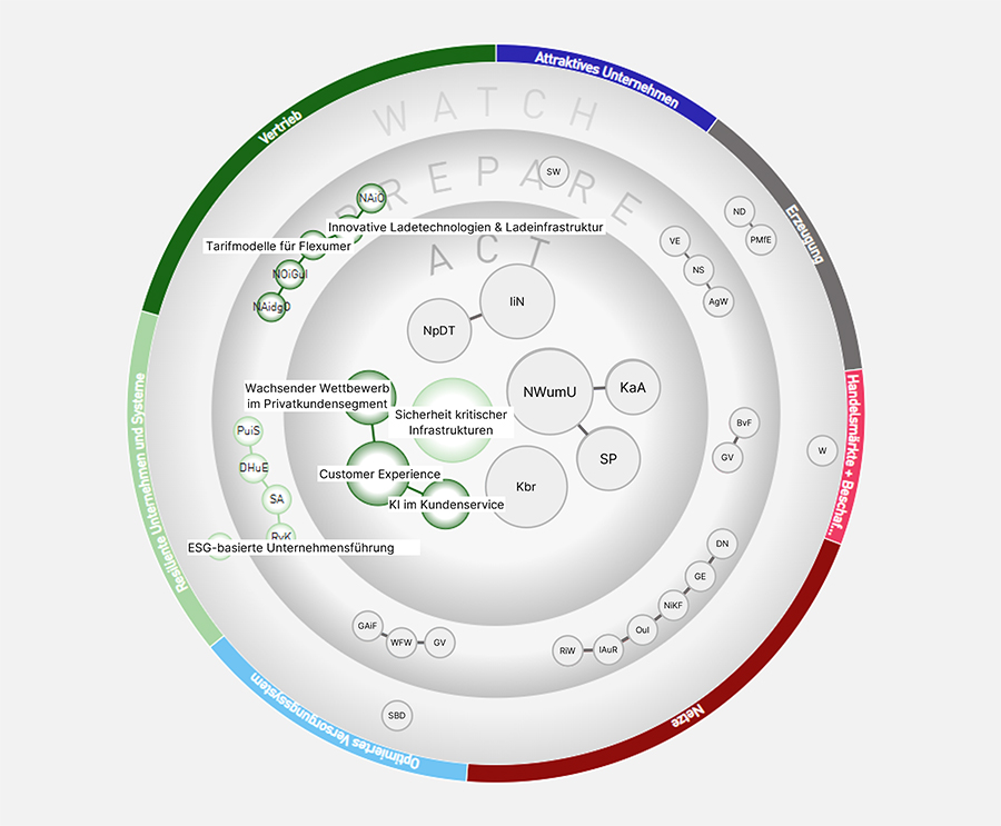 Aus den Bewertungen leitet Trianel konkrete Handlungsempfehlungen ab: Act, Prepare und Watch. Abbildung 1 gibt einen Einblick in die identifizierten Makrotrends der Kategorien Vertrieb sowie Resiliente Unternehmen und Systeme (Abb. 1).