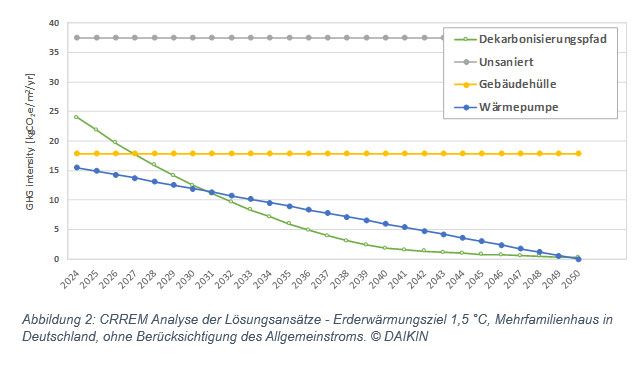 Die Wärmepumpenlösung hingegen ist zukunftssicher, da die Dekarbonisierung des Gebäudes parallel zur Dekarbonisierung der Stromproduktion verläuft, wie in Abbildung 2 dargestellt.