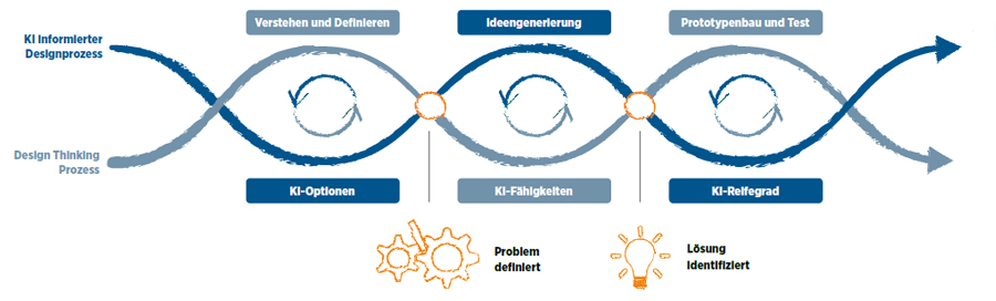 Dieses Konzept ist trotz erklärbarer Algorithmen bis heute in den wenigsten Anwendungen zu finden. Hier kann KI-spezifisches strategisches Design eine Schlüsselrolle spielen. Dazu gehört etwa Design Thinking als eine Methode zur systematischen Lösung komplexer Probleme und der Entwicklung neuer Ideen in der Schnittmenge von „wünschenswert für Nutzer“ (Desireability), „technische Durchführbarkeit“ (Feasability)“ und „Rentabilität für das Unternehmen“ (Viability). Weniger getrieben von den technischen Möglichkeiten, stehen bei der Entwicklung von praxisnahen Ergebnissen die Bedürfnisse und Ziele der Endnutzer im Mittelpunkt.