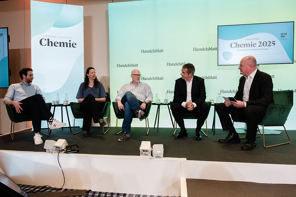 v.l.: Martin Bellof (Project Lead Ventures & Partnering – chemstars), Maike Lambarth (CEO & Co-Founder – Cyclize GmbH), Ingo Klöckner (Head of Portfolio Strategy & Reporting – Leaps by Bayer), Prof. Dr. Hannes Utikal (Dekan Fachbereich Wirtschaftswissenschaften, Leiter des Zentrums für Industrie und Nachhaltigkeit – Provadis Hochschule), Bert Fröndhoff (Teamleiter Industrie Ressort Unternehmen & Märkte – Handelsblatt)