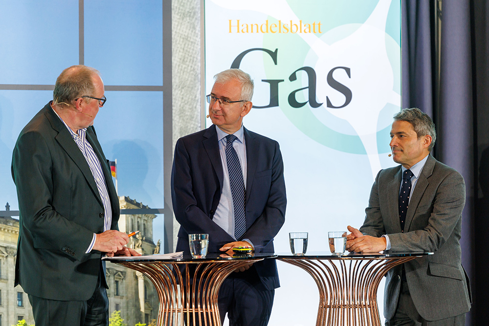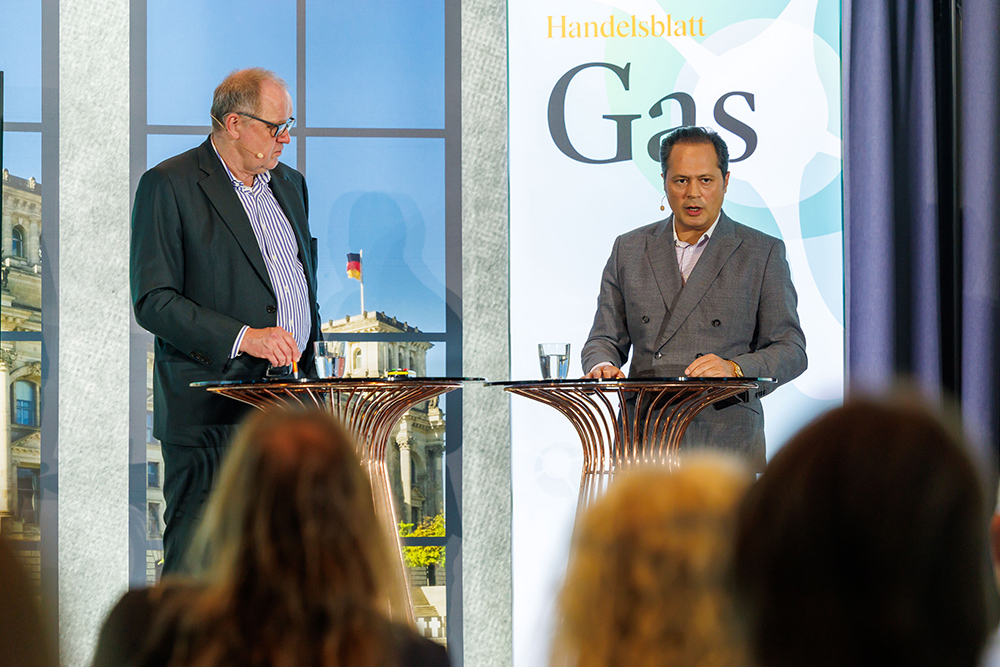 Auf dem Podium von links: Bernhard Kluttig, Abteilungsleiter für Wirtschaftsstabilisierung, Energiesicherheit, Gas, Wasserstoffinfrastruktur – Bundesministerium für Wirtschaft und Energie + Klaus Stratmann, Chefkorrespondent für Klima und Energie – Handelsblatt.