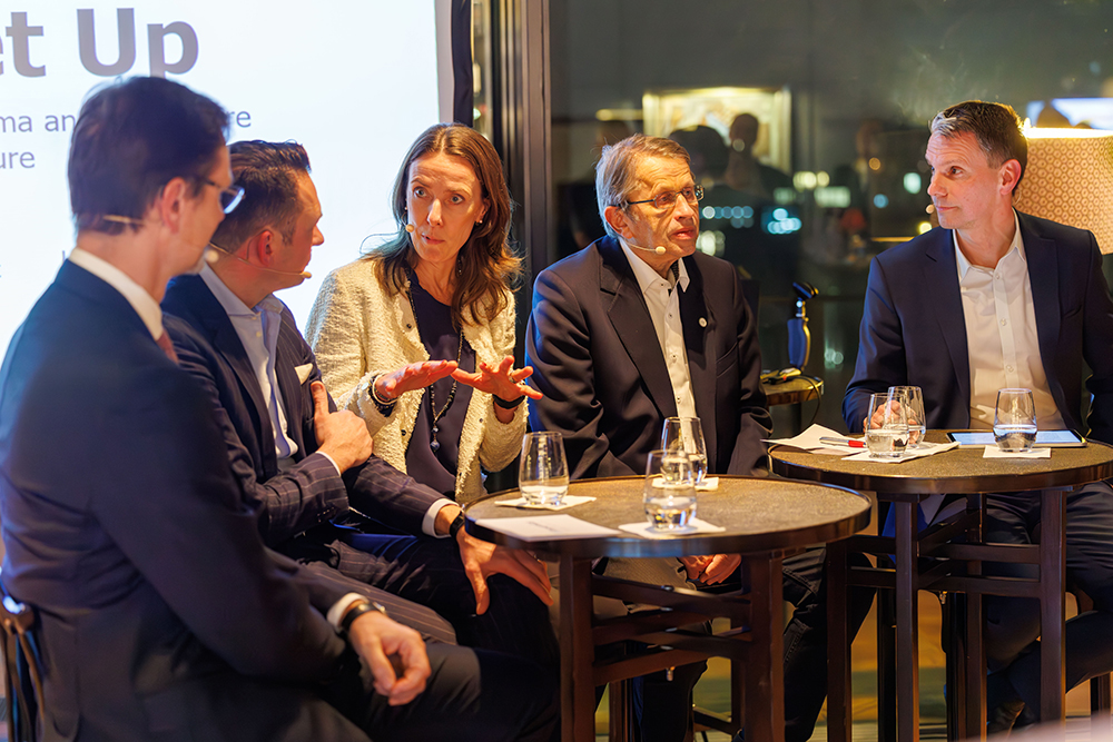 Auf dem Podium von links: Britta Rybicki, Redakteurin Gesundheitspolitik Handelsblatt; Dr. Maria Lena Weiss, Mitglied Gesundheitsausschuss, Berichterstattung Gesundheitswirtschaft im Wirtschaftsausschuss – CDU-Bundestagsfraktion; Thomas Ballast, stellvertretender Vorsitzender des Vorstands Techniker Krankenkasse; Frank Lucaßen, Chief Executive Officer – medac.