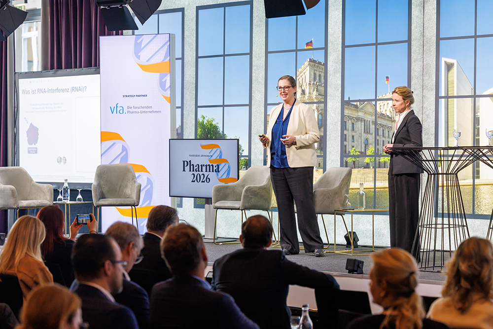 Auf dem Podium von links: Sandra Groeneveld, Moderation, Redakteurin & Host von „Handelsblatt Today“, Handelsblatt + Helena Smolak, Redakteurin Pharma – Handelsblatt.