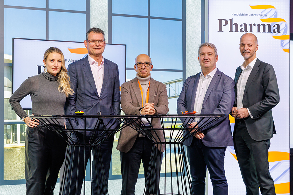 Auf dem Podium von links: Helena Smolak, Redakteurin Pharma – Handelsblatt; Thomas Weigold, Country President Sandoz Germany & CEO – Hexal; Tim Steimle, Fachbereichsleiter Arzneimittel – Techniker Krankenkasse; Dr. Kai Joachimsen, Hauptgeschäftsführer – Bundesverband der Pharmazeutischen Industrie (BPI); Kerem Inanc, CEO – Alliance Healthcare Deutschland GmbH.