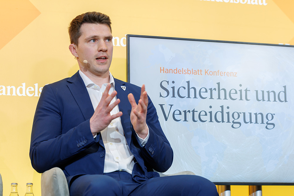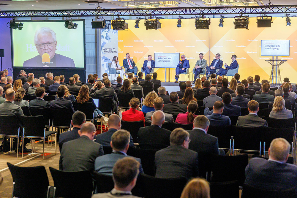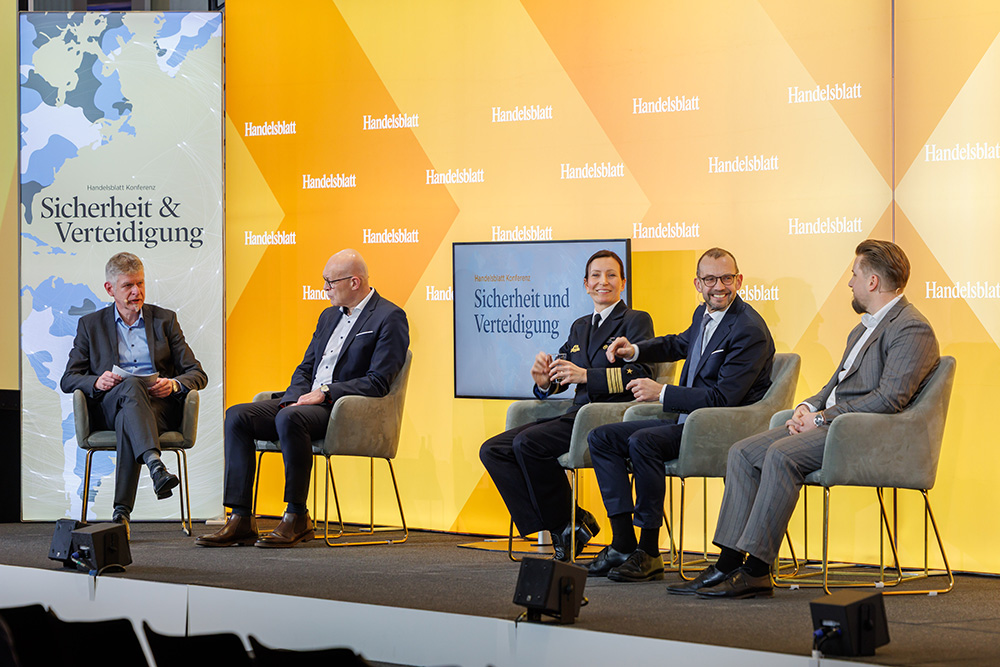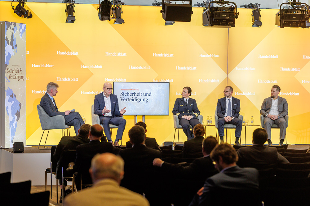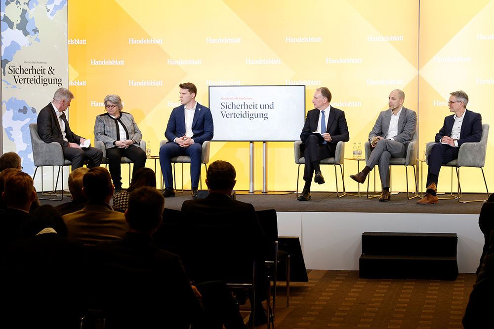 Auf dem Podium von links: : Larissa Holzki, Editorial Head of TECH – Handelsblatt; Generalleutnant André Denk, Chief Executive – European Defence Agency; Andreas Conradi, Executive Vice President, Head of Defense Europe – Capgemini; Armin Papperger, CEO – Rheinmetall AG, Präsident BDSV, Marc A. Wietfeld, CEO & Founder – ARX Robotics; Dr. Dennis Göge, Chief Executive & Vice President Europe – Lockheed Martin; Markus Fasse, Chefkorrespondent Unternehmen & Märkte – Handelsblatt.