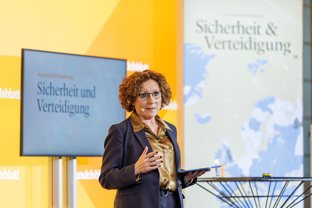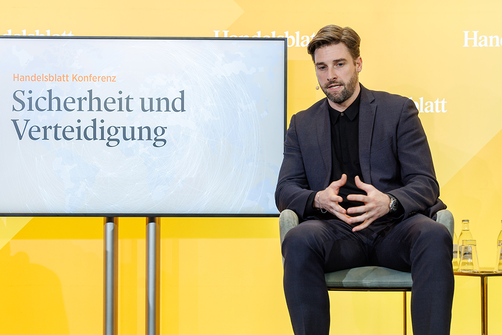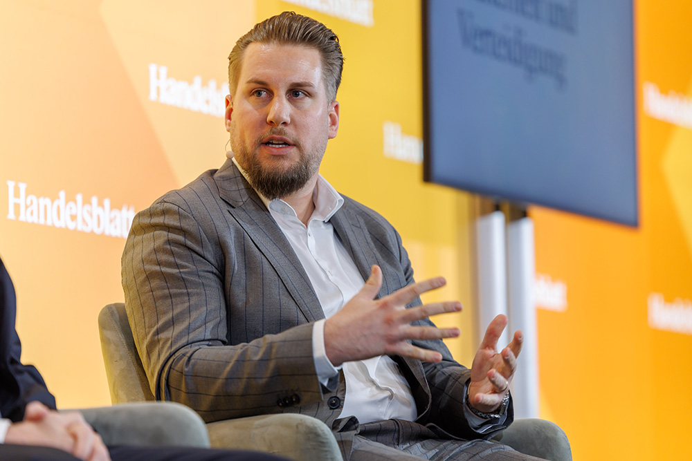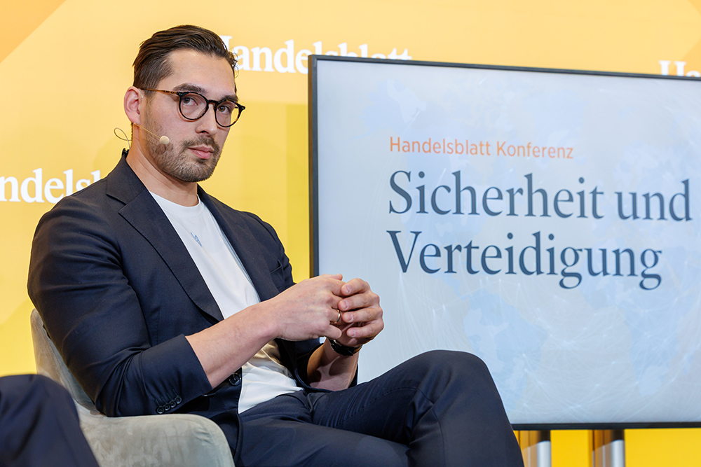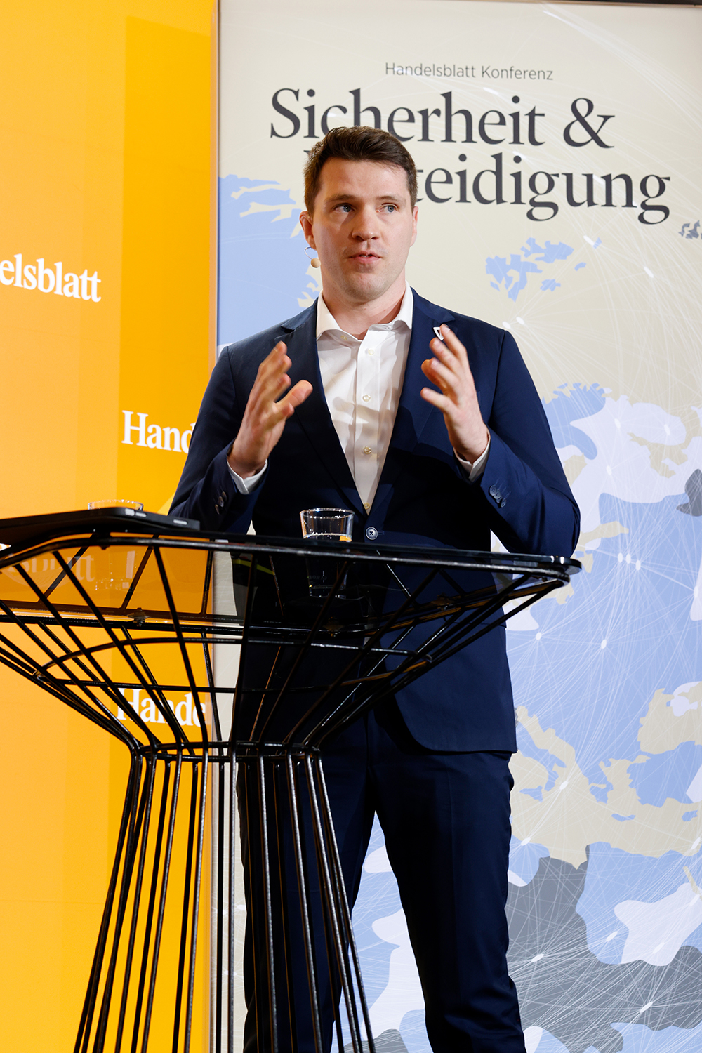 Auf dem Podium von links: : Larissa Holzki, Editorial Head of TECH – Handelsblatt; Generalleutnant André Denk, Chief Executive – European Defence Agency; Andreas Conradi, Executive Vice President, Head of Defense Europe – Capgemini; Armin Papperger, CEO – Rheinmetall AG, Präsident BDSV, Marc A. Wietfeld, CEO & Founder – ARX Robotics; Dr. Dennis Göge, Chief Executive & Vice President Europe – Lockheed Martin; Markus Fasse, Chefkorrespondent Unternehmen & Märkte – Handelsblatt.