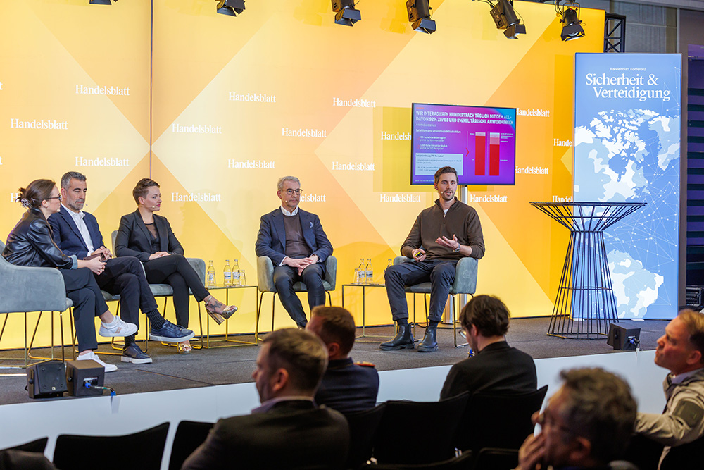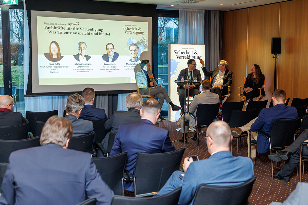 Breakout-Session 2 – Auf dem Podium von links: Moritz Schönleber, Head of Event Production – Handelsblatt Media Group; Sassan Parvin, Associate Director Public Sector & Defense – SThree; Markus Lehmann, Leiter Defence – Deutsche Telekom Business Solutions GmbH; Ilona Eulitz, Chief Human Resources Officer (CHRO) – BWI GmbH.