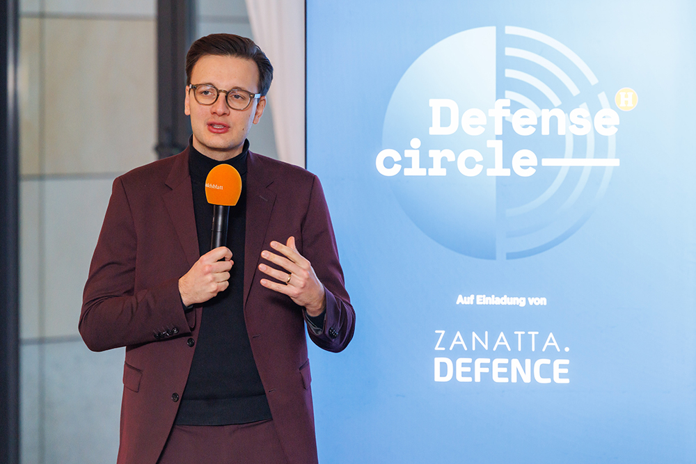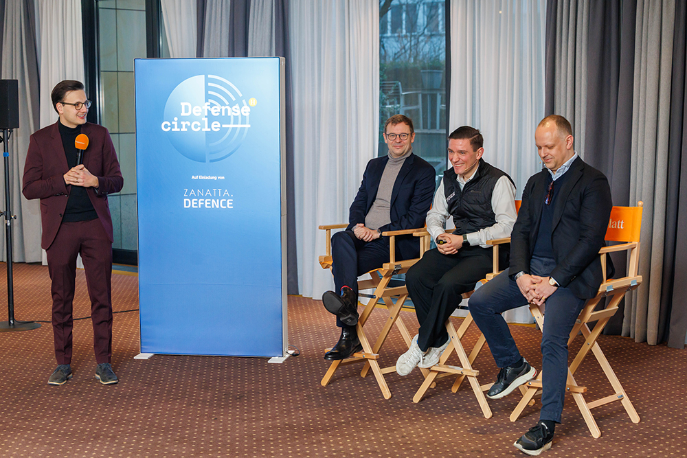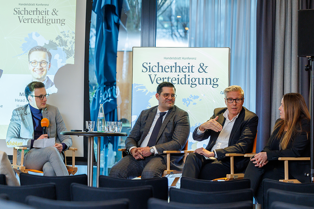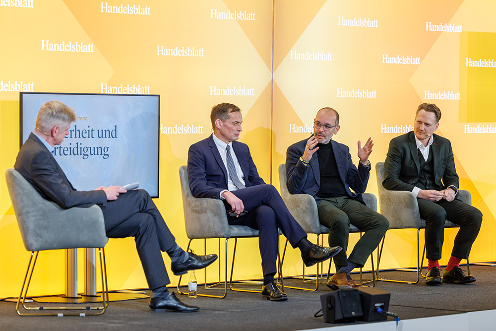 von links: Moritz Schönleber, Head of Event Production – Handelsblatt Media Group;Markus Fasse, Chefkorrespondent Unternehmen & Märkte – Handelsblatt; Paul C. Strobel, Public Affairs Lead & Spokesperson for Political Communications – Quantum-Systems GmbH + Marcus Zanatta, Founder & CEO – ZANATTA Defence.