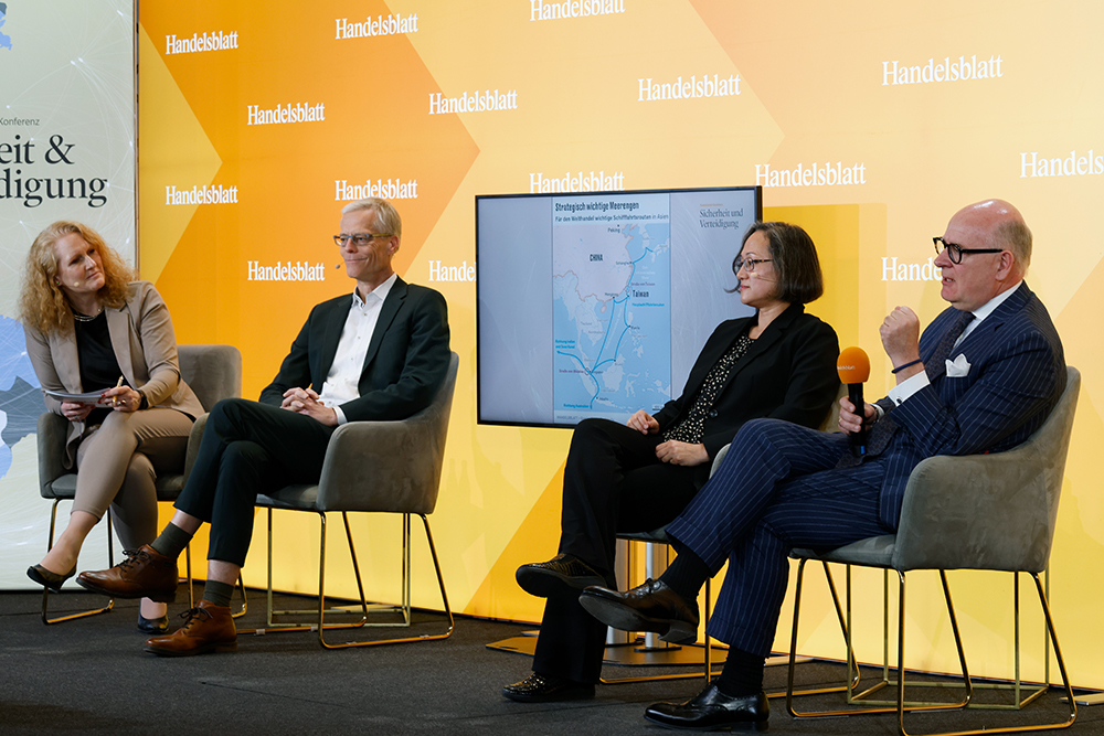 Auf dem Podium von links: Markus Fasse, Chefkorrespondent Unternehmen & Märkte – Handelsblatt; Cathrin Wilhelm, Gesellschafterin, Avilus GmbH – Mittelstandsbeauftragte, BDSV; Claire Wellby, Director, Private Equity – KKR; Thomas Erndl, MdB Verteidigungspolitischer Sprecher der CDU/CSU-Fraktion im Deutschen Bundestag.