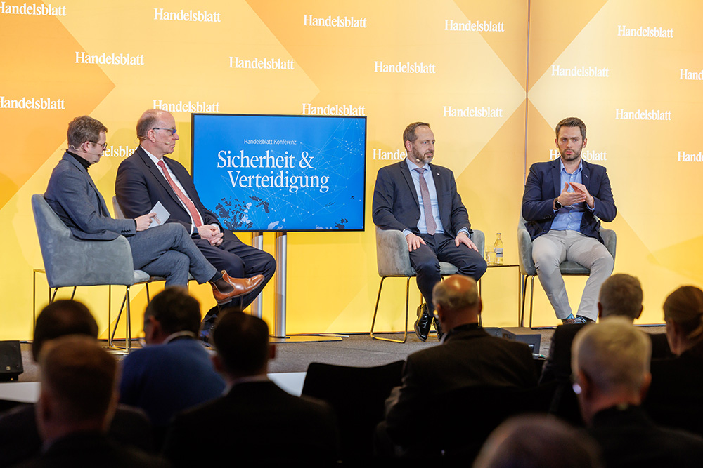 Auf dem Podium von links: Frank Specht, Redakteur – Handelsblatt; Dr. Andreas Fahrner, Leiter der Auswertung des BND; Benjamin Rohé, CEO – MONARCH; Marcel Taubert, Vice President Defence & Space – secunet Security Networks AG.