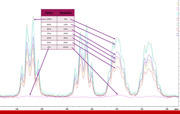 Durch die angewandte Methode zur Aufarbeitung der Probe mit anschließender Messung am 1H-NMR-Gerät erkennt man einen Zusatz von Margarine ab ca. 10 % des verwendeten Fettes. Sowohl die Diglyceride (Abb. 1), als auch die Monoglyceride (Abb. 2) zeigen sich deutlich im Spektrum.