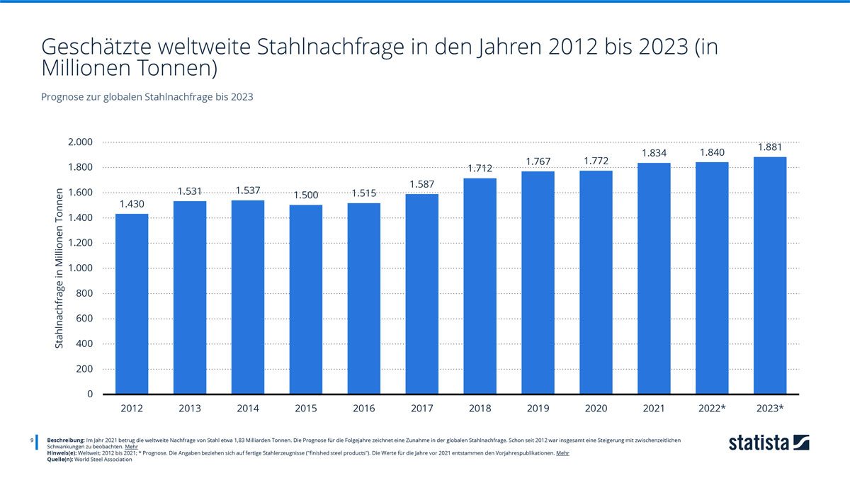 Stahl ist einer der wichtigsten Rohstoffe, weswegen es nicht wunderlich ist, dass auch für dieses Jahr ein Anstieg der weltweiten Stahlnachfrage prognostiziert wird. Zwar trüben Inflation und der Krieg zwischen Russland und Ukraine die Aussicht. Der Anstieg der Weltbevölkerung begründet allerdings, warum die größte Menge des weltweiten Stahlverbrauchs in den Bereichen Gebäudebau und der Infrastruktur benötigt wird. Auch der immense Stahlverwendung für mechanische Geräte und Automobile deutet darauf hin, dass sich die ansteigende Prognose für das Jahr 2023 bestätigt.