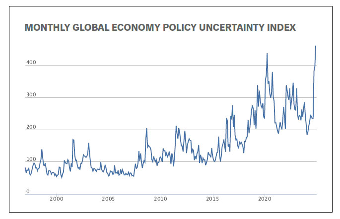 Die weitere politische Entwicklung ist volatil, und die Unsicherheit entsprechend groß. Der Global Economic Policy Uncertainty Index zeigt bereits seit Monaten ein historisch hohes Maß an Unsicherheit.