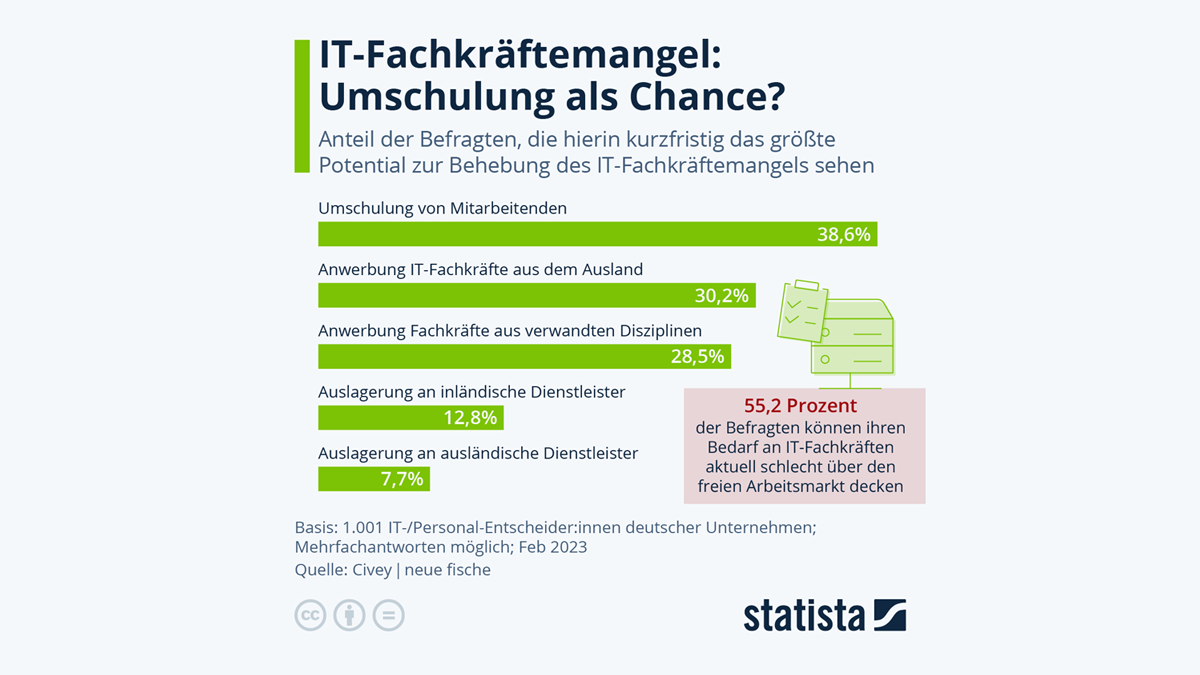 74 Prozent der deutschen Unternehmen, die vom Branchenverband Bitkom zwischen August und Oktober 2022 befragt wurden, klagen derzeit über einen Mangel an IT-Fachkräften. Offene Stellen bleiben durchschnittlich bis zu sieben Monate unbesetzt. Obwohl verschiedene Maßnahmen zur Behebung dieses Engpasses existieren, wie beispielsweise die Anwerbung qualifizierter Fachkräfte aus dem Ausland, wird deren Potenzial zur kurzfristigen Schließung der Personallücke nicht in vollem Umfang anerkannt.