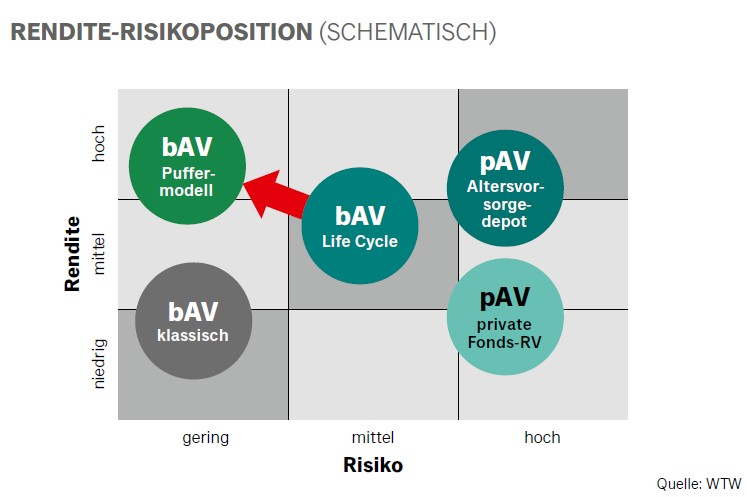 Eine von Willis Towers Watson (WTW) durchgeführte Analyse verschiedener Altersvorsorgemodelle bestätigt die Überlegenheit des kollektiven Puffers. Im Vergleich zur klassischen bAV (Festzinszusage, in der Regel unter 4 Prozent), der privaten Altersvorsorge als Lebensversicherung im Fondsmantel, dem privat angelegten Altersvorsorgedepot und der bAV mit Life-Cycle Management schneidet der kollektive Puffer mit dem besten Rendite-Risiko-Profil ab. Denn: Kollektive Puffer bieten zusätzliche Sicherheit ohne Verzicht auf Rendite. Die Bildung eines Puffers senkt zwar potenziell die mögliche Wertsteigerung, führt jedoch auch zu einem Werterhalt der Anwartschaften. Durch die Bildung eines Puffers werden kurzzeitige oder auch wiederholte Werteinbrüche abgefedert, was im Interesse der Begünstigten ist. Ein kollektiver Puffer macht durch das verbesserte Risikoprofil auch die Anlage in renditestärkere Investments möglich.