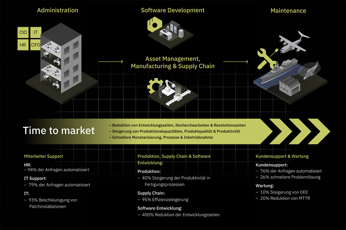 Dass dies möglich ist, zeigt ein Blick auf die „IBM Client Zero Story“. IBM hat in den letzten zwei Jahren seine eigenes KI- und Automatisierungsportfolio – darunter die IBM watsonx Suite – konzernweit eingesetzt. Das Ergebnis: Einsparungen von 3,5 Milliarden Euro inklusive signifikanter Effizienzgewinne in allen adressierten Unternehmensbereichen – von der (Software-)Entwicklung, Lieferkette und Produktion über den Einkauf bis hin zur Finanzabteilung und Personalverwaltung. Die nachstehende Graphik gibt Einblicke in ausgewählte Use Cases bei IBM. Da es der Rüstungsindustrie nun primär nicht um Kostenersparnis geht, liegt auf der Hand. Somit würde die Adaption der genannten Technologien zwar finanzielle Spielräume kreieren, beispielsweise für einen höheren Forschungsetat oder die Einstellung neuer Fachkräfte, jedoch sind auch genau diese rar und erst nach einiger Zeit Einarbeitung vollumfänglich produktiv. Viel wichtiger ist demnach, dass die vorhandenen, eingearbeiteten Mitarbeitenden ihre Kompetenzen den Rüstungsunternehmen maximal bereitstellen – durch die Unterstützung von vertrauenswürdigen Technologien.
