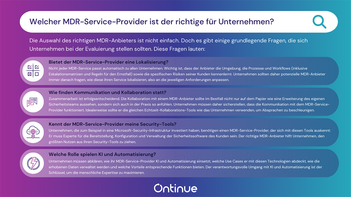 Es ist jedoch von entscheidender Bedeutung, dass Unternehmen potenzielle MDR-Anbieter eingehend prüfen. Nur so können sie sicherstellen, dass der MDR-Service-Provider seine Dienste auf ihr Unternehmen zuschneiden und einen wirklich lokalisierten Service in großem Umfang bieten kann. Ohne diese Fähigkeit ist er kein echter Sicherheitspartner, sondern nur ein weiteres Tool, das die unternehmensinterne IT-Abteilung verwalten muss.