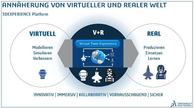 Heutzutage ist ein virtueller Zwilling dynamisch, 3D basiert online verfügbar und kann viele verschiedene Systeme verbinden, um diese über ihren gesamten Lebenszyklus zu begleiten. Der virtuelle Zwilling lernt von Echtzeiterfahrungen und bleibt somit immer aktuell, wodurch das Modell an jedes neue Szenario angepasst werden kann. Großprojekte wie langfristige Beschaffungsprojekte können dadurch erstmals ganzheitlich betrachtet werden. Fähigkeiten, Anforderungen und Verfügbarkeiten von komplexen Systemen über einen langen Zeitraum können früh und kontinuierlich optimiert, hohe Programmkosten gesenkt und das Management der Systeme deutlich vereinfacht werden.
