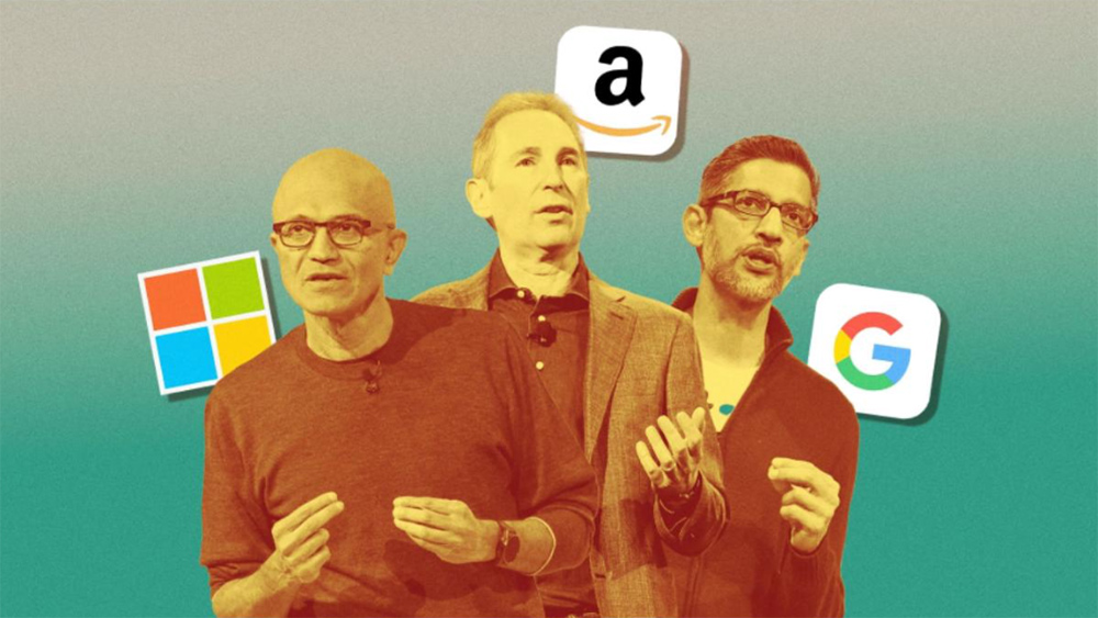 Konzernchefs Nadella, Jassy, Pichai (v. l.): Die Investitionen wachsen schneller als die Renditen. (Foto: Getty Images (2), Reuters)