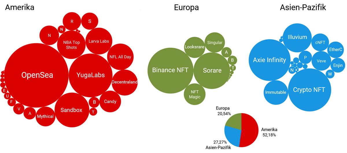 Bereits die durchgeführte Untersuchung der weltweiten Top-100-NFT- und Metaverse-Plattformen zeigt, dass bereits in den letzten 24 Monaten circa 86 Milliarden US-Dollar Wert bei den NFT- und Metaverse-Plattformen entstanden ist. Hier sind immer noch die USA mit rund 52 Prozent Anteil führend. Die Region Asien-Pazifik kommt auf einen Wert von circa 27 Prozent und Europa scheint den Zug mit einem Anteil von rund 20 Prozent bei den modernen Plattformen jedenfalls nicht verpasst zu haben.