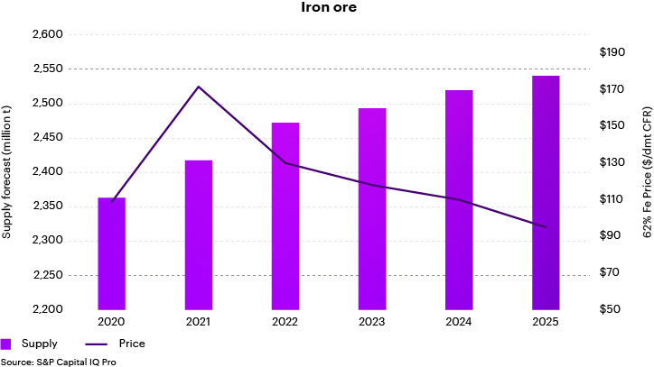 Obwohl ein signifikanter Preisrückgang über die nächsten fünf Jahre zu erwarten ist, steigt das Angebot von Eisenerz von Jahr zu Jahr. Von 2.350 Millionen Tonnen 2020 wird die verfügbare Menge auf prognostizierte 2.550 Millionen Tonnen bis 2025 steigen.