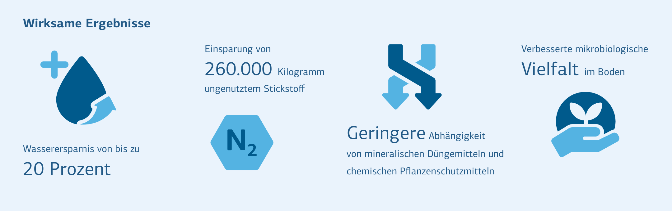 Durch mikrobiologisch angereicherten Kompost und innovative Erntetechniken wird die Bodenfruchtbarkeit gesteigert, die Wasserspeicherung verbessert und der Einsatz mineralischer Dünger reduziert. Die Folge: bis zu 20 % Wassereinsparung, geringeres Unkrautwachstum und sinkende CO₂-Emissionen. Das Projekt dient als Modell für andere Nutzflächen in der Region und zeigt, wie ökologische Innovationen wirtschaftlich tragfähig sein können.