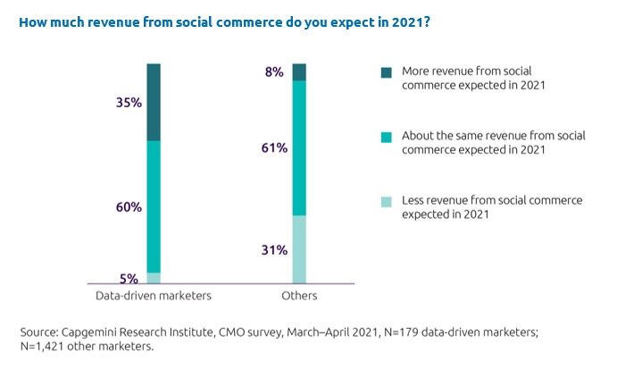 Im Rahmen der Studie „A New Playbook for Chief Marketing Officers” von Capgemini haben wir im Pandemiejahr 2021 untersucht, was das Erfolgsrezept datengestützter Marketing-Abteilungen ist und welche Vorteile sie genießen. Demnach erwarteten 35 Prozent von ihnen mehr Umsatz durch Social Commerce – gegenüber nur 8 Prozent der klassisch agierenden Vergleichsgruppe.