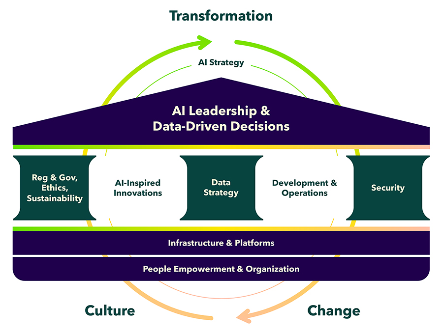 Am Anfang jeder erfolgreichen KI-Transformation steht ein klares Zielbild. Es definiert, welche Rolle KI künftig in der Organisation spielen soll, etwa bei Effizienzsteigerungen, datengetriebenen Entscheidungen, neuen Geschäftsmodellen oder der Gestaltung des Arbeitsplatzes von morgen.