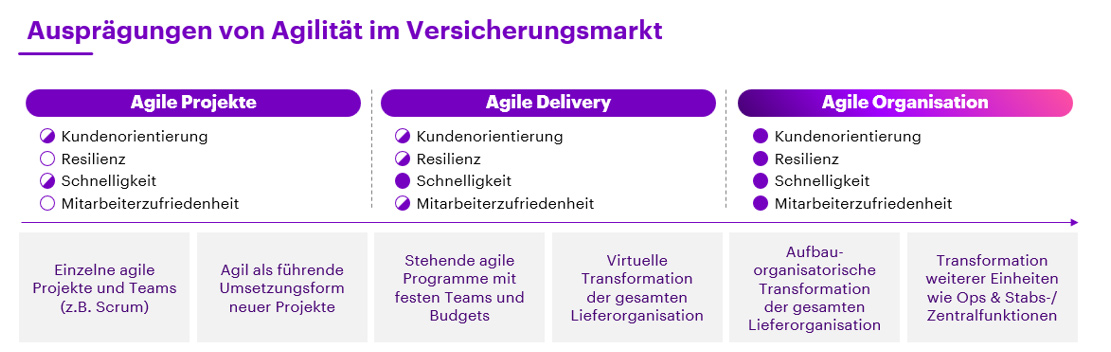 Die Versicherungsindustrie war über viele Jahrzehnte geprägt von der Philosophie starker funktionaler Silos und arbeitsteiliger Spezialisierung. Im digitalen Zeitalter stößt dieses Modell jedoch zunehmend an seine Grenzen – aus Sicht der Kundenerwartungen, aus Sicht der Mitarbeitenden und auch aus Sicht von Markt und Wettbewerb. Wer als Versicherer Kunden spürbar in den Mittelpunkt stellen, Produkte und Services schneller und flexibler an die Rampe bringen, die Innovationskraft seiner Organisation stärken und für neue Generationen von Mitarbeitenden attraktiver werden will, für den bietet Agilität eine Vielzahl an Bausteinen zur grundlegenden Veränderung.